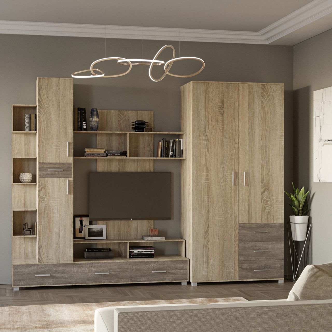 Практична та надійна конструкція складається із стінки для вітальні та великої розпашної шафи з трьома висувними ящиками. Також стінка укомплектована ТВ-полицею для телевізора. Дана модель - це максимально практичні меблі для облаштування сучасної вітальні.